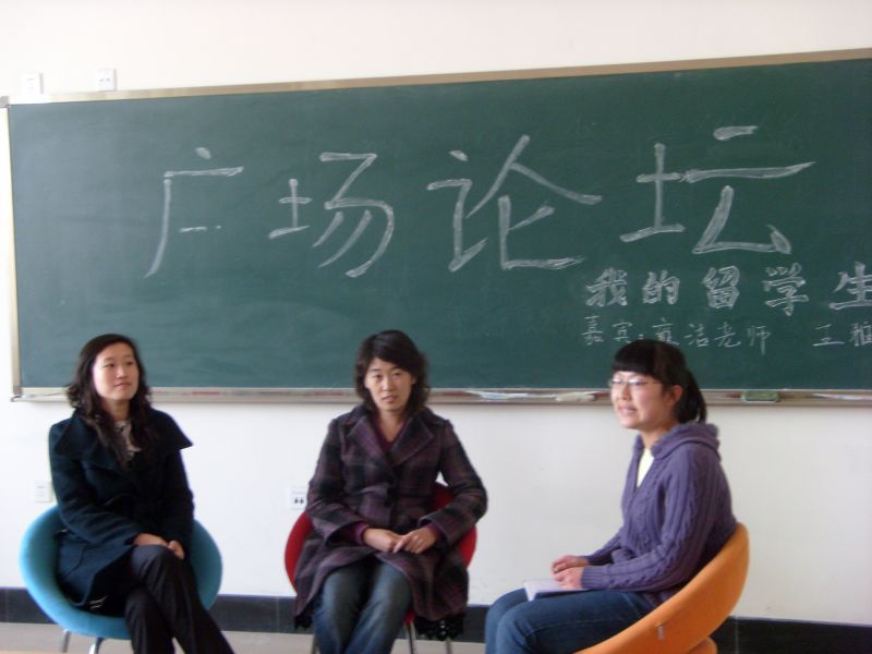 临近结束时,两位老师对出国留学问题发表了自己的看法。她们认为,出国留学可以拓展视野,培养自己的独立能力,但也面临着举目无亲,课业繁重等方面的压力。她们告诫有出国意愿的同学,“心态要调整好”,“准备战线不要拉太长”,而且一定要在大学里学好自己的专业知识,出国后才能更快地学好英语版本。出国留学可以作为就业的资本,但不是决定性因素,关键还是用人单位的意向和个人综合能力。最后,两位老师还热情地回答了同学们的提问。