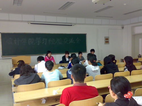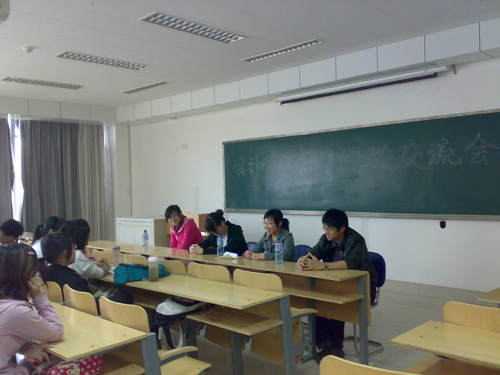 06级学生迁入校本部已有一个月,站在大三的路口上,很多同学对于以后的发展情况不是很清晰。为了使大三学生们更快找到自己的发展方向和目标,天天澡日日澡狠狠澡欧美学习部于10月9日下午在逸夫楼举办了学习经验交流会,我院学生会主席胡啸、副主席贾琳琳、质点通讯社社长李艳华及会本0505班团支书王思光担任了此次交流会的嘉宾。