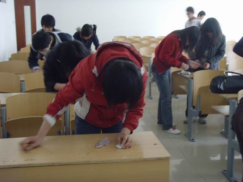 来自12个学院的160多名志愿者自带抹布、橡皮、小刀等工具齐聚教学楼,开始了他们的清洁工作。每10人为一个小组,负责相对的一个中型教室和一个小教室,其中中型教室由于平日课程多,“课桌文化”现象比较严重,为清洁重点。大家先用抹布整体擦过一遍,接着用橡皮和小刀对课桌上的字迹和污垢进行具体清理,再配合使用抹布将纸屑和橡皮末收拾干净。其中圆珠笔和记号笔的字迹尤为顽固,费了志愿者们不少力气。最终,大部分课桌都恢复了他们本来的面目,让在场的所有人都感到十分欣慰。