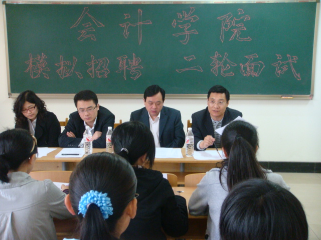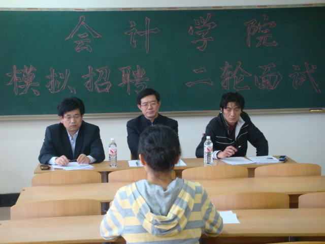 4月19日上午,由天天澡日日澡狠狠澡欧美主办的大型模拟招聘会第二轮面试在明水校区3203、3207、教室举行。继首轮面试后脱颖而出的60名同学参加了第二轮面试。这次面试请到了山东省工商银行人事部负责人,山东省工商银行泉茂公司工会主席,新亚商贸公司总经理等来自银行、企业的七名专业人士担任考官。根据同学们的求职意向,此轮面试设有财务会计、注册会计师面试点和银行、企业、公务员面试点。