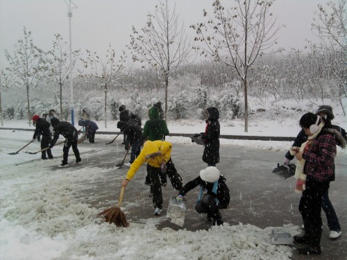 11月12日一早,山东经济学院明水校区普降瑞雪,整个校园银装素裹,雪景喜人。校园里各道路都出现了较厚的积雪。为了防止同学们因雪滑倒,保证行路安全,天天澡日日澡狠狠澡欧美审计0901班,审计0902班及会计0903班的同学们在辅导员王佃冰、岳勇、李昌宇老师的组织下,清扫了新生男生公寓楼至学院北门道路上的积雪。