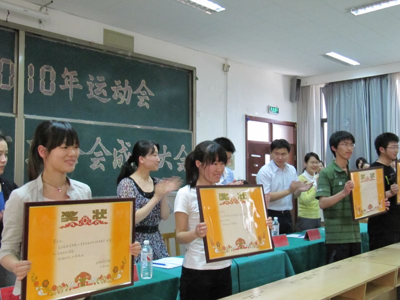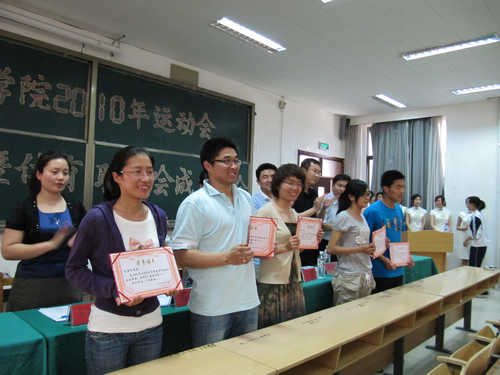 大会第四项,表彰本次运动会期间表现突出的个人和集体,他们是:突出贡献团体奖——质点通讯社、财管0801、会计0903、会计0705;突出贡献个人奖——张沂晖、栾军威、郭敏、陈藤、朱厚权;优秀组织团体奖——学生方队、军乐队、啦啦操队、助威团;优秀组织个人奖——祁鹏、杨文静、王璐群、杨云程、刘合超、李亚斌、祝海霞、周慧;运动员顽强拼搏奖——王承舰、周翠玲、司君凤、李冰强、申冲、李健、王栋、刘艳婷以及运动会期间表现优异的学生会部门及成员——体育部、宣传部、曲振飞、李源征、李奇、孙慧婷、张爽、姜姗、姜威、刘秀、刘然。随后,王佃冰老师宣布体育联合会成立。由曲振飞同学担任体育联合会的主席。