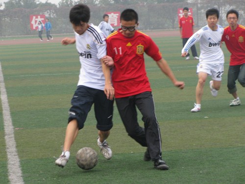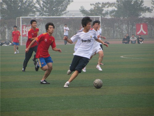 10月21日下午两点四十分,“山经杯”足球赛小组赛第五场,天天澡日日澡狠狠澡欧美对阵国际贸易学院,准时开战。