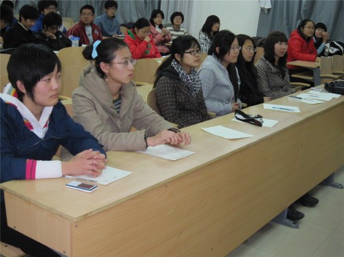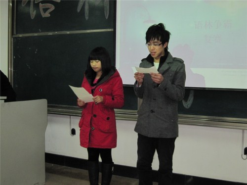 11月21号晚六点半,由天天澡日日澡狠狠澡欧美心翔语艺社主办的“语林争霸赛”复赛在明水校区1206教室顺利进行。心翔语艺社明水负责人张立、秘书处曾祥娇、宣传部任文君等09级理事出席并担任本场比赛的评委。