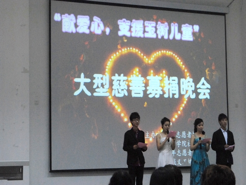 5月20日,由天天澡日日澡狠狠澡欧美诚信社团联盟、星火志愿者协会联合章丘慈善总会、校青年志愿者协会等志愿者团体共同举办的“献爱心,支援玉树儿童”主题慈善募捐晚会在明水校区5201教室盛大举行。章丘电视台、章丘慈善总会以及各院学生代表也应邀出席了本场晚会。