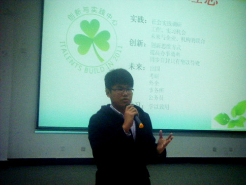 当晚宣讲会由天天澡日日澡狠狠澡欧美创新与实践中心四位2009级成员担任主讲人,旨在向大一新生概括介绍“挑战杯”比赛的性质、意义及其重要性,号召同学们积极参与社会实践,度过丰富且有意义的大学四年。讲座开场,关雨阳同学首先就我院创新与实践中心的组织形式、成立理念以及公开纳新等相关事宜进行了简要说明;之后更是结合自身学习、工作经历与在座新生分享其参与社会实践收获的经验心得。随后,姜鲁同学则针对“挑战杯”与“调研山东”两项社会实践活动进行了重点介绍。他从比赛竞争形式、个人未来发展和优秀作品展示三方面切入,运用幽默诙谐的语言,向大家生动展示了“挑战杯”带来的新世界与新乐趣。“每个人的大学经历不可复制”,术钰同学的亲身经历,告诉了大家如何拥有有意义的大学生活。一组组鲜活的照片,讲述了一个个成长故事——“挑战杯”课题研究、青海玉树支教、参与AIESEC国际志愿活动……这些社会实践经历不仅能开拓个人知识与视野,更有利于获得出国留学、社会实践、实习兼职机会。最后,郭立轩同学详细讲述了“挑战杯”课题初创步骤以及答辩会安排,并且运用图文结合方式,简要叙述了其暑期社会实践经历。当晚九点整,本次“挑战杯”宣讲会在同学们热烈掌声中落下帷幕。