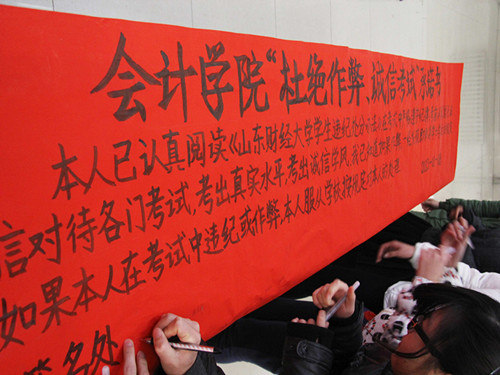 会后,与会的学生干部们进行了“诚信考试承诺书”签名,大红的纸张上一个个郑重而认真的名字,筑造起圣井校区学生干部们诚信做人、认真备考、扎实工作毅力和决心。