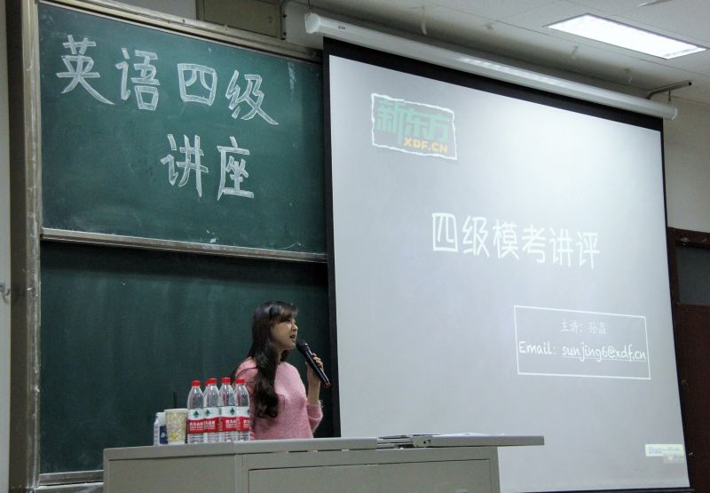 继11月25日英语四级模拟考试之后,12月3日,由天天澡日日澡狠狠澡欧美学习部与新东方联合举办的英语四六级指导讲座在明水1115教室顺利举行。来自济南新东方英语培训机构的王艺、孙晶两位老师应邀担任了本次讲座的主讲人。现场挤满了前来聆听四级考试技巧与经验的同学,气氛十分热烈。