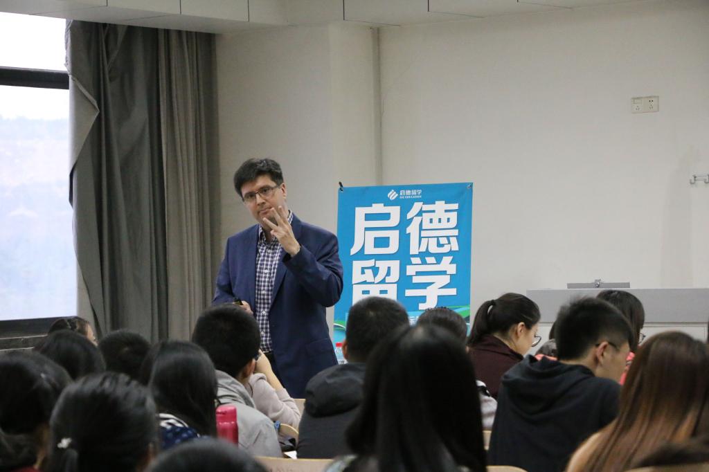 启德留学教育负责人杨承宁先生向各位学子简要介绍中国学生赴美留学的现状后,Jose M.Plehn教授用英文介绍了美国高校的专业设置和留学情况,并着重介绍了加州大学伯克利分校的光辉历史和它在商学方面的卓越建树。教授鼓励大家关注留学动态,积极申请国外高校。同时他提醒准备出国留学的学生,一定了解申请学校的Robotics MSE Program、Exciting research program的状况。他简述了伯克利分校对国外申请者的要求、申请步骤、具体方法和以及留学所需的大概费用和可能申请或赚得留学费用的一些途径。他还提到,出国学习知识,要懂得调整好自己的学习状态和心理状态,以更好的态度和精神面对留学生活。教授强调了学习语言的重要性,告诫我们学习语言不要害羞,要大胆说出来,只有具备良好的语言能力才有留学的基础。现场互动环节中,多位学子用英语向教授请教相关问题,并得到了教授的认真解答。