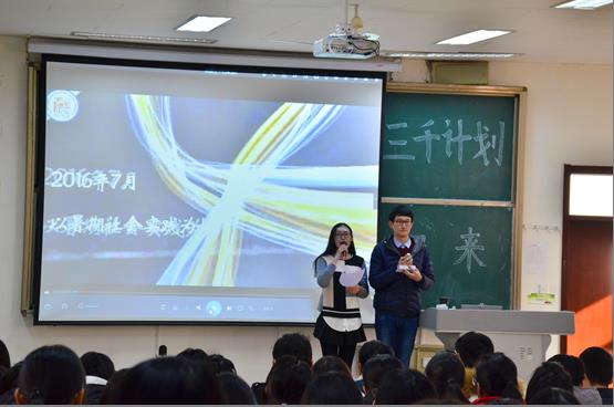 “三千计划”,即学生社会实践进“千村、千社区、千企业”计划,是我校规模最大、最受重视的社会实践活动。为了使2016级同学更加深入了解“三千计划”,社会实践部特别举办实践归来话感受分享会。分享会分为A、B两类,分别在2111和4301教室进行。
