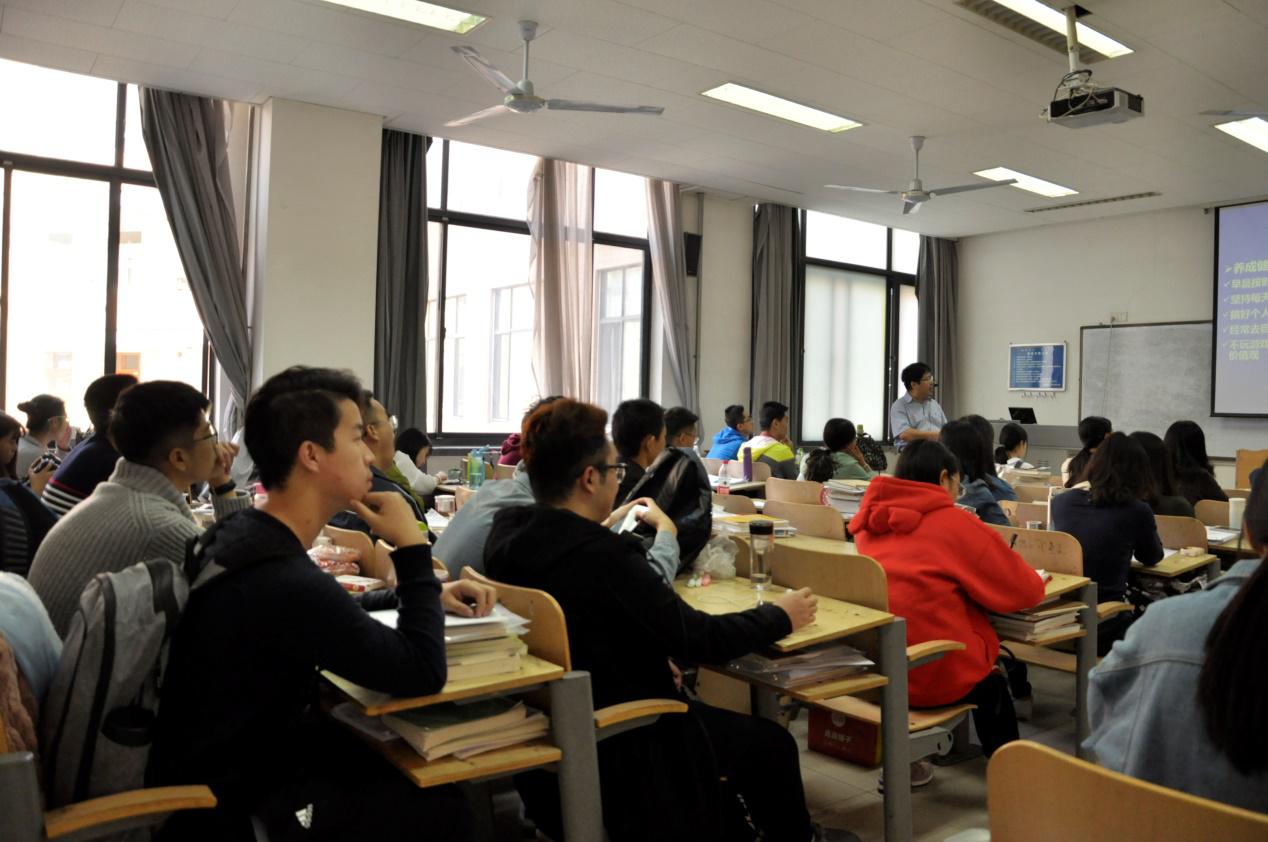 赵老师主要讲了三个问题。第一个是“大学学什么、怎么学”。首先,赵老师比较了高中与大学学习的不同:大学注重自我管理,而不再是教师管理;大学学习的是知识、技能、为人处事、礼仪、健康、娱乐等多方面内容,不再像中学单以学知识为主;大学要以理解和实践为基础来学习,不再主要以记忆为基础学习。针对大学自我管理的特点,赵老师提出“管好自己,天下无敌”。其次,赵老师针对大学学习和考研路上的两大“拦路虎”——英语和高等数学,在学习方法上给同学们提出了很多具体量化的建议,要求大家专业课后复习时间至少是上课时间的2倍。随后,赵老师谈到会计专业课的学习,要求大家多用实例理解会计概念和原理、多问为什么、多做练习,绝不能死记硬背。