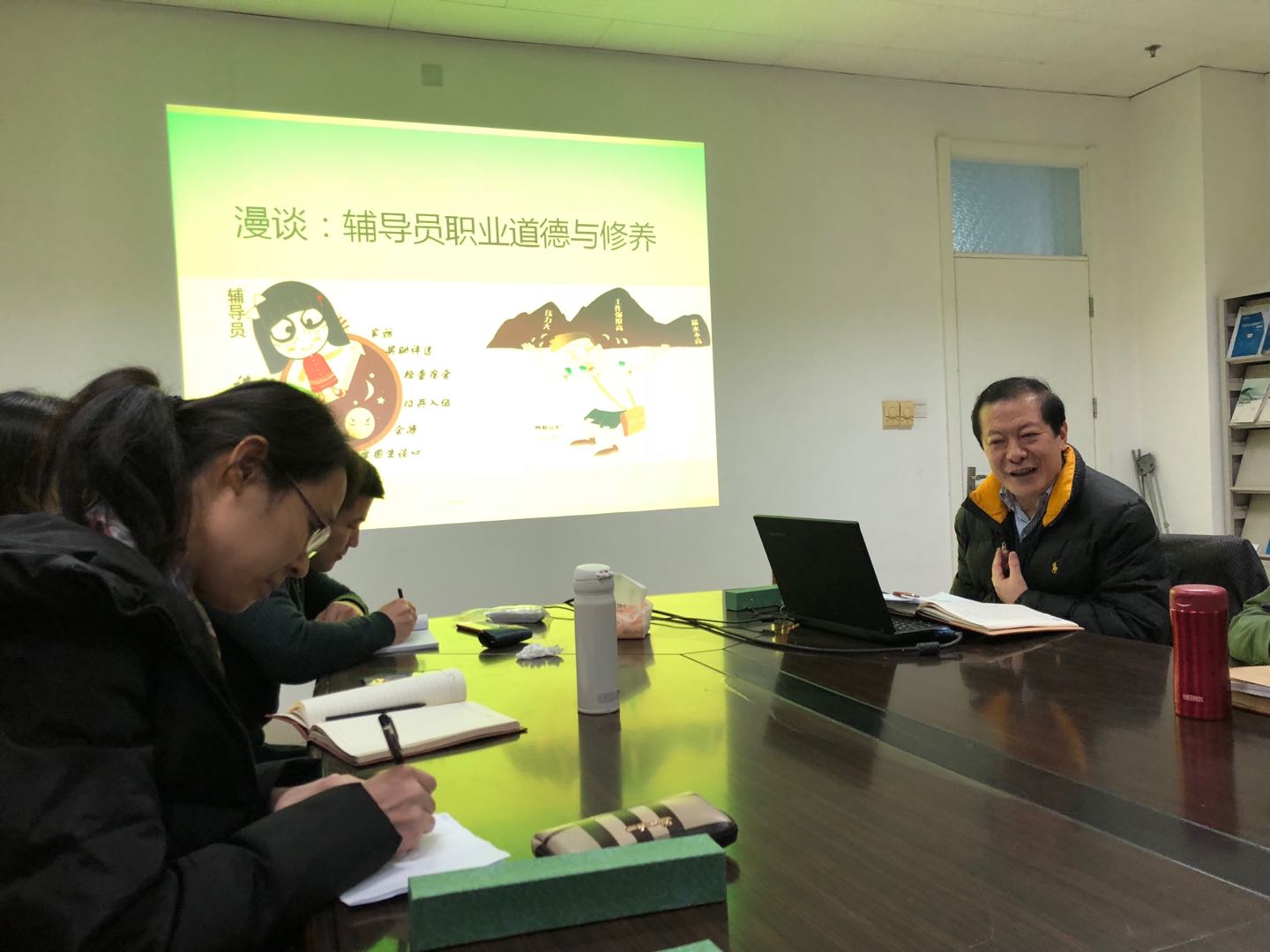 会议开始由学院党委张涛书记作题为《漫谈:辅导员职业道德与修养》的报告。张书记首先从几位感动中国人物说起,提到了“种得桃李满天下,心唯大我育青禾”的华南农业大学教授卢永根,“作别康河的水草,归来作祖国的栋梁”的吉林大学地球物理学专家黄大年以及“三十六年,为梦想跋涉,僵直了手指,沧桑了面孔,但初心不变”为村民在悬崖修凿近万米水渠的贵州村支书黄大发,由他们孜孜不倦、坚定信念、无私奉献的事迹激励大家要兢兢业业甘心、用心、全心投身于本职工作。张书记还通过丰富的数据和事例总结了当前大学生在政治价值观、道德价值观、生活价值观和职业价值观存在的普遍问题,从而提出辅导员之于大学生的角色定位应该从三个方面概况,即政治教育者、道德塑造者、服务者兼管理者。所有从事大学生思想政治教育的人员,都要坚持正确的政治方向,加强思想道德修养,增强社会责任感,成为大学生健康成长的指导者和引路人,引导学生如何做人、如何做事。最后张书记提出辅导员工作不仅是一门科学,更是一门艺术,辅导员事业则是可以追随一生、仰望一生的事业。他充满热情和饱含期许的报告让在座的各位辅导员老师受益匪浅,为大家上了精彩的开学第一课。