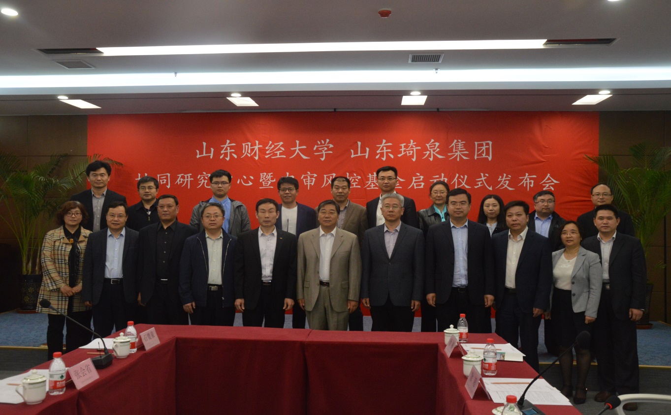 4月24日下午两点半,由山东财经大学、山东琦泉集团共同举办的“协同发展中心暨内审风控基金启动仪式发布会”在琦泉集团多功能会议厅举行。山东省审计厅内审指导中心主任温国栋、山东省内部审计师协会会长陈朝豹、济南市审计局秘书长张会省以及山东琦泉集团以副董事长马文德为代表的集团领导、山东财经大学副校长张新、合作发展处处长刘奇耀、天天澡日日澡狠狠澡欧美院长王爱国、天天澡日日澡狠狠澡欧美党委副书记崔东峰、合作发展处副处长徐超、天天澡日日澡狠狠澡欧美会计信息化系主任石贵泉、合作发展处科长徐彬和十名山东财经大学学生准时到场参会。本次发布会主题是“多样经济内审风控协同研究中心暨内审风控基金启动专题发布”,会议由山东琦泉集团法务审计部主任赵青主持。