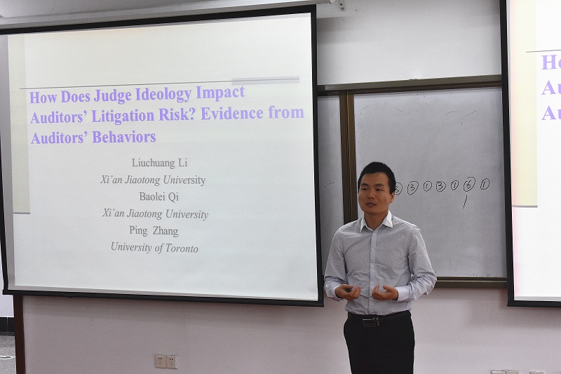 齐堡垒教授做了题为《How Does Judge Ideology Impact Auditors’ Litigation Risk? Evidence from Auditors’ Behaviors》的主题报告。首先,齐教授介绍了“美国联邦法官的政治倾向对审计师诉讼风险的影响”的研究背景。然后,他对“法官政治倾向及其对判决的影响”“审计师诉讼风险的影响因素”“审计师面临高诉讼风险的反应”三方面的文献进行梳理并提出三个假设:一是在民主党法官主导的管辖区域,审计师会收取更高的审计费用;二是在民主党法官主导的管辖区域,审计师会提供更高的审计质量/付出更多的审计努力;三是在民主党法官主导的管辖区域,审计师会发表更加保守的审计意见。最后,齐教授阐述了“联邦法官政治倾向”的两种衡量方法、样本选取、模型构建及实证检验过程,并得出如下结论:在民主党法官主导的管辖区域,审计师会收取更高的审计费用,发表更加保守的审计意见,但审计师在提供更高的审计质量/付出更多的审计努力方面并不显著。