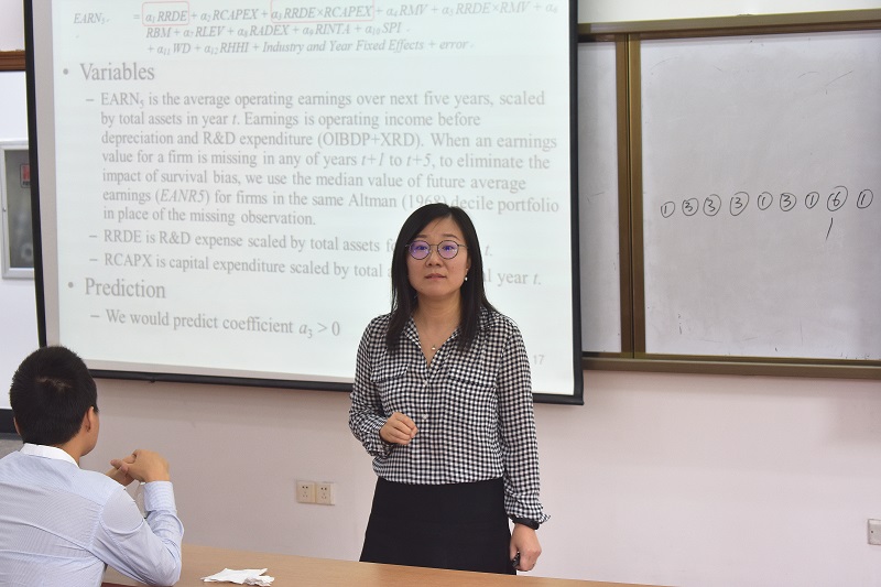 朱振梅副教授做了题为《R&D Investment and Firm Performance: The Role of Tangible Asset Complementarity》的主题报告,报告围绕背景与动机、研究问题、研究设计、实证结果、后续问题五部分展开。首先,朱老师介绍了研究背景,对已有文献梳理分析后,提出“补充性有形资产是否会影响研发投入与未来公司业绩之间的关系”这一研究问题。其次,她阐述了详细的研究过程。朱老师指出,考虑到要将未来五年的盈余作为被解释变量,故选取1975-2011年期间的61349家美国R&D公司作为研究样本;考虑到规模经济的影响,故将市场价值与研发投入的交乘项作为控制变量放入研究模型。最后,朱老师还提出六个后续问题并分别进行检验:①补充性有形资产对两者关系的作用,是否因其减少了R&D的风险?②R&D对专利数的影响?③补充性有形资产在不同竞争强度的行业中的作用?④补充性有形资产在公司不同生命周期中的作用?⑤分析师能否提前意识到补充性资产的作用?⑥对股票回报业绩的影响?
