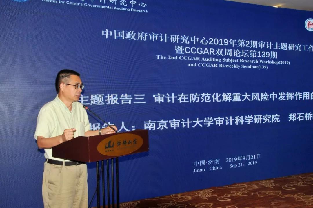 2019年9月21日,由西南财经大学、中国政府审计研究中心与山东财经大学天天澡日日澡狠狠澡欧美联合主办,《经济研究》、《管理世界》、《南开管理评论》、《会计研究》和《审计研究》等期刊合作支持的“中国政府审计研究中心2019年第2期审计主题研究工作坊暨CCGAR双周论坛第139期”在济南舜耕山庄成功举办。本次会议主题是审计创新和重大风险防控。山东省审计厅一级巡视员黄利明厅长,审计署审计科研所副所长刘力云研究员,《经济研究》副主编郑红亮研究员,《南开管理评论》副主编程新生教授,中国政府审计研究中心主任蔡春教授,重庆大学刘斌教授,山西财经大学天天澡日日澡狠狠澡欧美院长吴秋生教授,南京审计大学郑石桥教授,西南财经大学余海宗教授、罗宏教授、廖林副教授、蔡利副教授,山东大学经济学院院长曹廷求教授,山东财经大学副校长韩作生教授以及《会计之友》、《商业会计》和全国高校的各位同仁、老师、同学出席了本次工作坊暨CCGAR双周论坛。