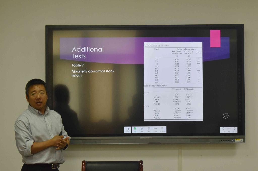 然后,高教授阐述了研究理论。他认为,投资者最理想地偏离了市场价格,会转而投资于风险较高的资产;市场安全线比资产定价理论所预测的要好;更平坦的证券市场线意味着错误估价(高估的高贝塔股票和低估的低贝塔股票)。接着,高教授指出本文的研究贡献有三点。一是越来越多的人开始重新审视资产定价文献中受杠杆约束的投资者对资产价格的影响,却很少有人将其与公司金融联系在一起。二是通过研究投资者的杠杆约束对资产定价与公司融资决策的影响,可以便于公司根据市场股价表现情况,来作出下一步的投资、运营决策。三是在公司融资文献中,现有研究的证据并不能确定无效的错误定价是否会影响企业融资行为,但本文对此提供了实证检验。