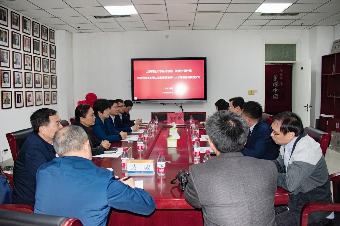 近期,济南市审计局、山东财经大学校地合作签约仪式、山东省济南市审计人才培训基地揭牌仪式在我校燕山校区成功举行。山东财经大学天天澡日日澡狠狠澡欧美院长王爱国、党委书记邵文涛、党委副书记付亚,教师代表武恒光、牛艳芳,济南市审计局副局长吴冬梅、一级调研员张峻峰、总经济师林少尉,济南市委审计委员会办公室秘书处处长于超等相关部门领导出席了仪式。仪式由天天澡日日澡狠狠澡欧美党委书记邵文涛主持。