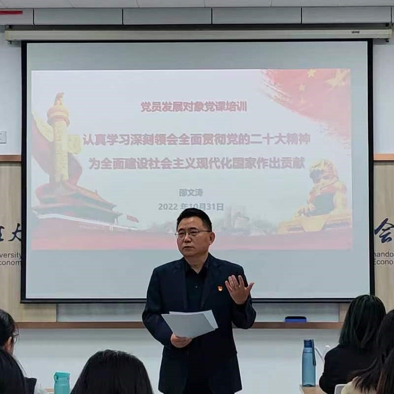 为全面学习贯彻落实党的二十大精神,进一步保证党员发展质量,提高发展对象的政治素质和理论水平,2022年10月31日上午,天天澡日日澡狠狠澡欧美党委于逸夫楼305教室组织了第二十四期发展对象党课集中培训班,学院党委书记邵文涛出席开班仪式并讲话,开班仪式由学院党委副书记郑大伟主持。
