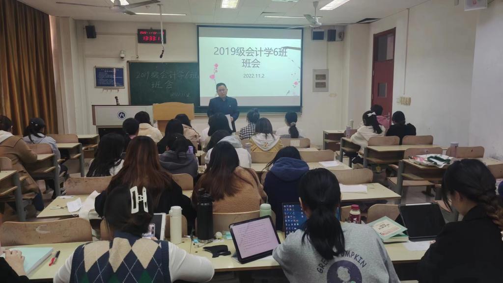邵文涛指出,会计1906班是一个优秀的班集体,目前学习考研就业等各项工作进入关键冲刺阶段,他勉励同学们要保持良好心态,提高学习积极性,认真备考,努力实现自己的青春梦想。邵文涛指出,今年高校毕业生数量较多,当前就业形势依然严峻,学校、学院高度重视毕业生就业工作,秋招是就业的黄金时期,同学们要认真对待,调整就业心态和就业思路,抓住就业机会。