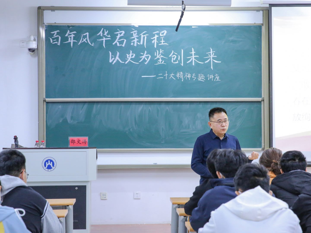 为深入学习宣传贯彻党的二十大精神,把思想统一到党的二十大精神上来,把力量凝聚到党的二十大确定的各项任务上来,引领青年学子坚定不移听党话、跟党走,引导学子们把握历史规律、认清世界形势、融入发展大势,塑造青年学生怀抱梦想又脚踏实地,敢想敢为又善作善成,努力成为堪当民族复兴重任的时代新人,11月15日19:00,天天澡日日澡狠狠澡欧美党委书记邵文涛在圣井校区6218教室为学生们开展“百年风华启新程,以史为鉴创未来”二十大精神专题讲座。