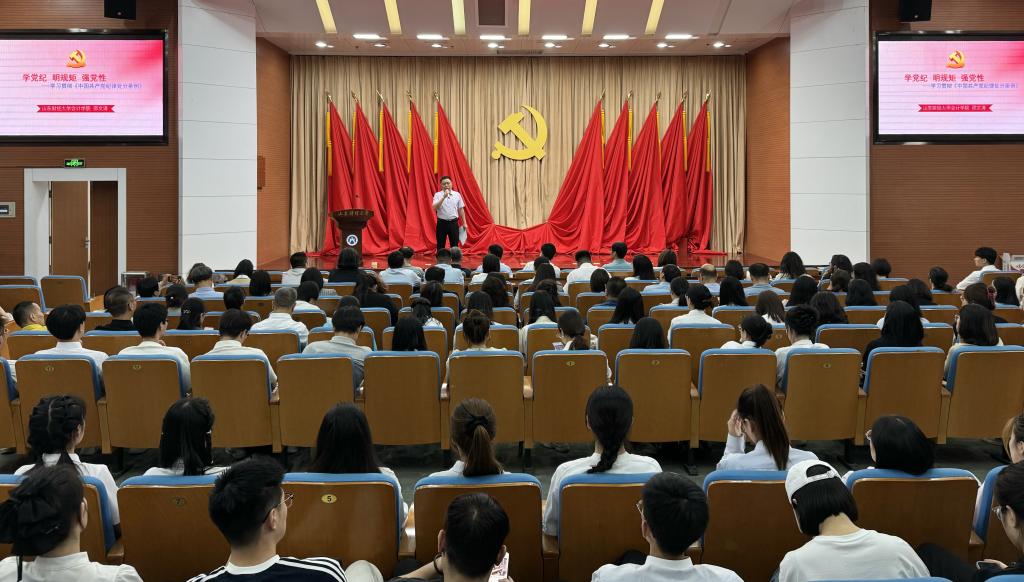 为深入开展党纪学习教育,强化全体党员纪律意识,进一步严明党的纪律规矩,5月10日下午,会计党委书记邵文涛以“学党纪 明规矩 强党性——学习贯彻《中国共产党纪律处分条例》”为题,在燕山校区图书馆报告厅为全院师生党员讲授党纪学习教育专题党课。