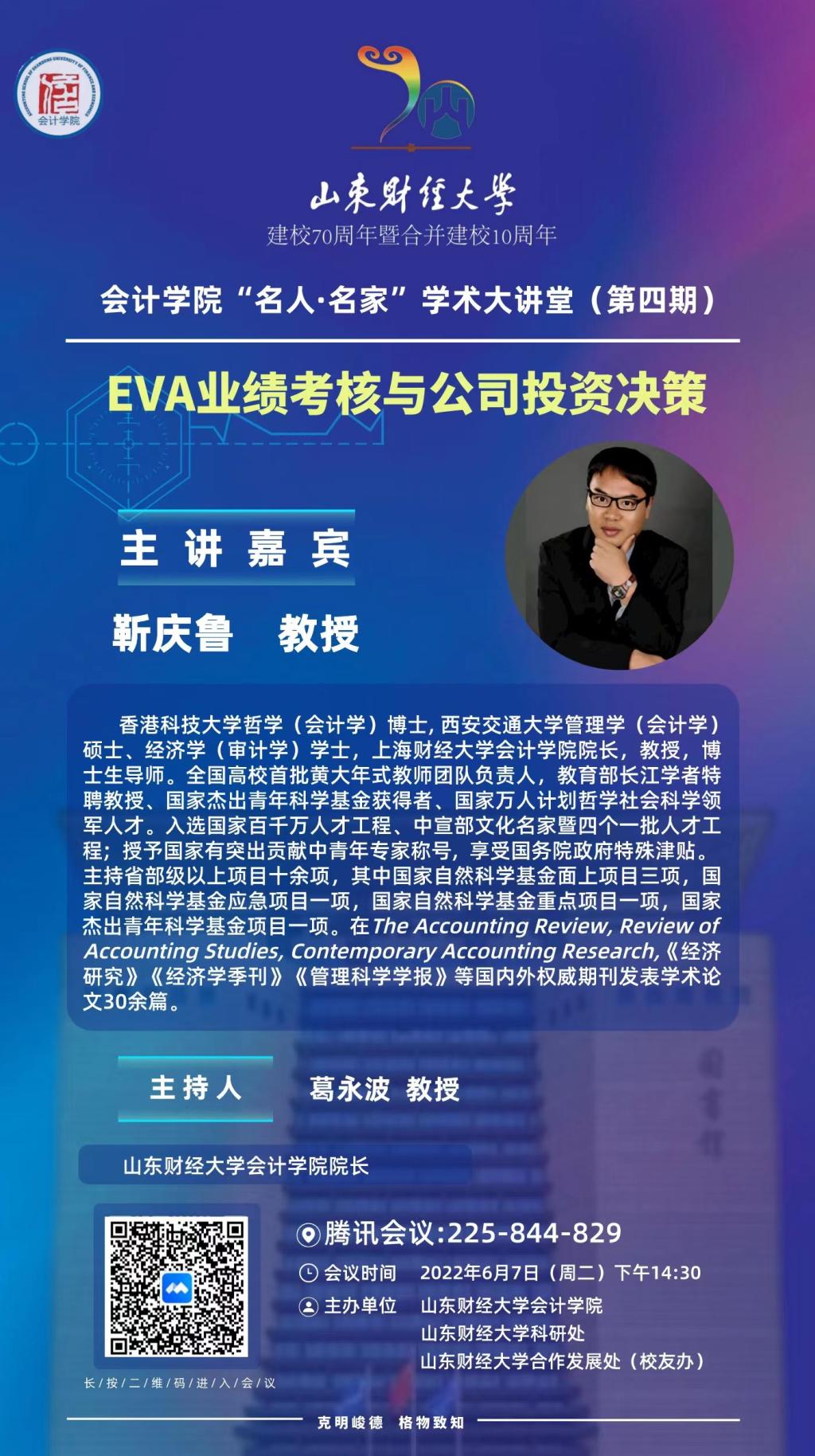 第四期“名人·名家”学术大讲堂将由上海财经大学天天澡日日澡狠狠澡欧美院长靳庆鲁主讲,主题为:EVA业绩考核与公司投资决策。