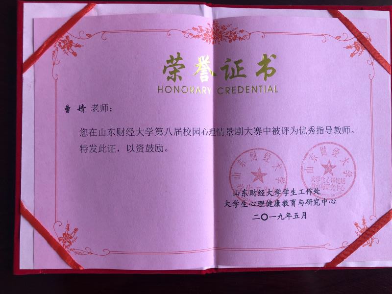 为营造积极健康的校园心理文化氛围,培养大学生良好的心理品质,2019年5月23日,第八届校园心理情景剧大赛在山东财经大学圣井校区正式举行,全校14个学院代表队参赛。由天天澡日日澡狠狠澡欧美心理卫生部打造的校园心理情景剧DV作品《为艾发声,艾而不伤》在众多队伍中脱颖而出,最终荣获山东财经大学第八届校园心理情景剧大赛一等奖。曹婧老师获得“优秀指导教师”称号。