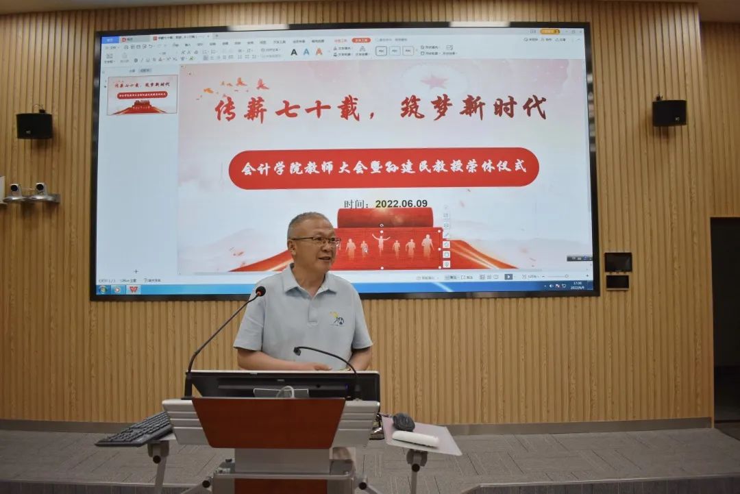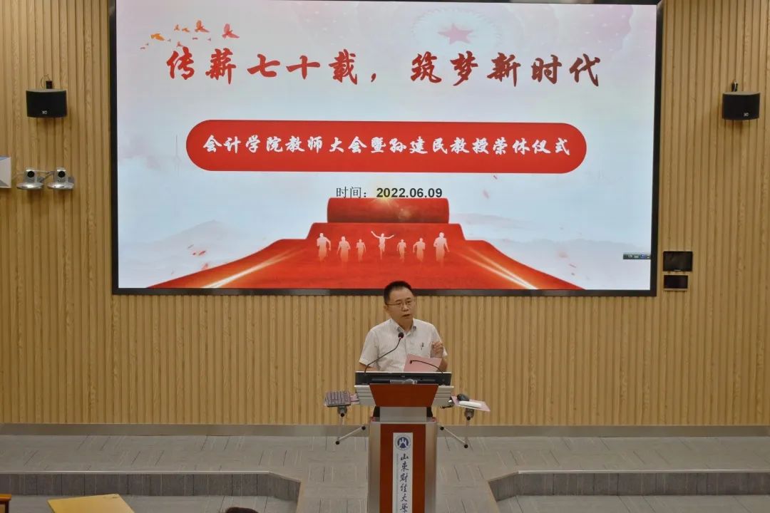 邵文涛向各位老师表达感谢,天天澡日日澡狠狠澡欧美学生体量大,学生工作压力大,疫情之下,各位辅导员奋斗在防疫一线,保障学生的日常生活;全体老师认真备课、上课,保障教学活动的照常进行。随后,邵文涛对天天澡日日澡狠狠澡欧美为庆祝山东财经大学建校七十周年暨合并建校十周年所作的准备进行简要介绍:第一,院史录《儒风和畅》记载了前辈对天天澡日日澡狠狠澡欧美的付出,奠定了会院发展的基石,激励师生将院史和奋斗精神传承下去;第二,话剧《前路》以校友为人物原型,讲述了山东财经大学70年来自强不息、砥砺前行的故事,展现了学校人才培养薪火相传的精神;第三,院史图片展、红色会计展通过老物件、老照片,追忆山东财经大学党的建设、学科建设、人才培养的艰苦历程;第四,学生成果汇编、“书香会院”读书成果沙龙展现会院学工成果,是“立德树人”的具体体现。每一位校友、老师、学生的付出,都是为了表达对学校、学院深厚的情感。