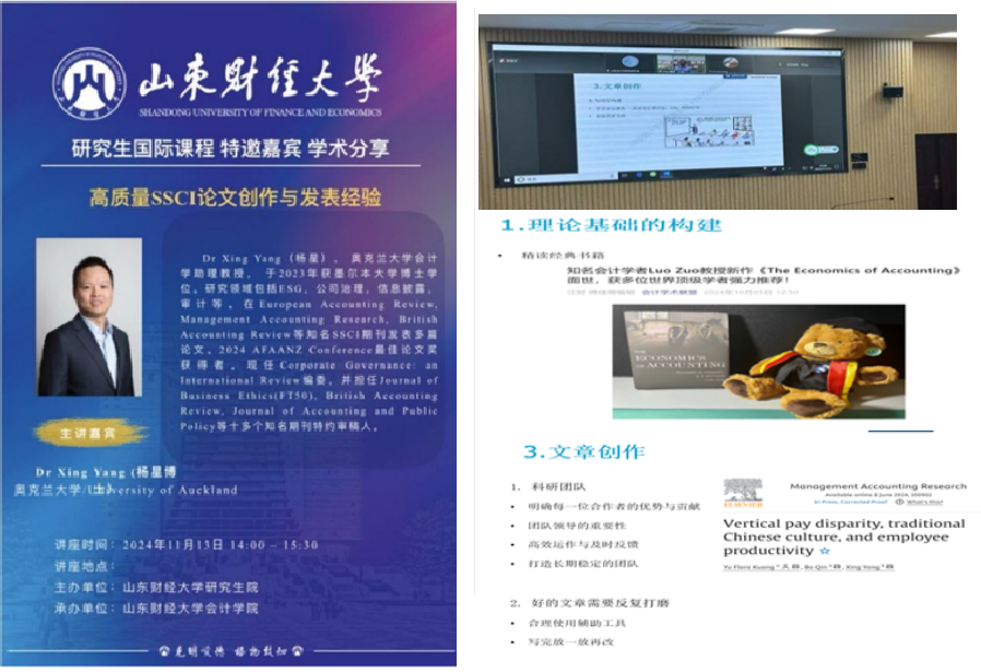 在讲座中,杨博士不仅分享了学术论文中常见问题的解决方案,还特别强调了如何通过选题创新和逻辑严密的理论构建来提升文章的学术价值。他重点推荐了国际知名学者,会计顶刊TAR、JAR和JAE的编委左罗教授等撰写的经典著作The Economics of Accounting,强调了无论是初入门的会计学研究生还是经验丰富的会计学者都值得深入研读。他的经验之谈为同学们提供了实用的操作指导,激励了大家在学术研究与写作领域追求卓越的热情。整场讲座内容充实、干货满满,为在场师生开阔了视野,也为他们在英文学术论文发表道路上提供了有益的参考与启发。