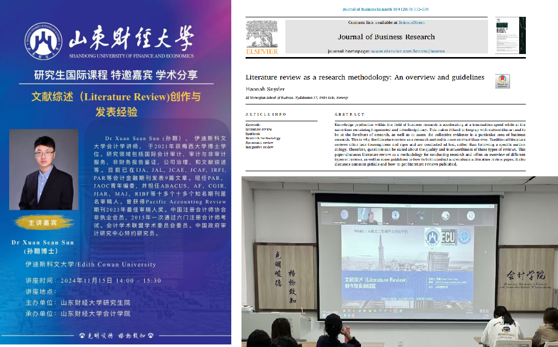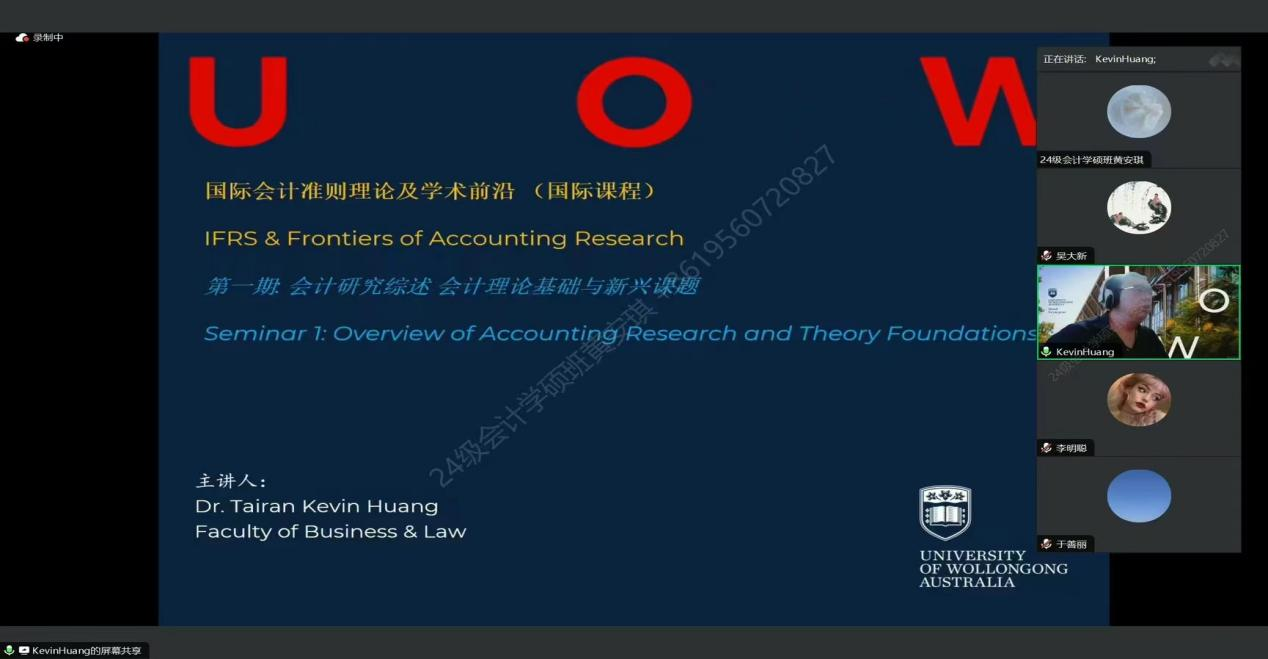 应学院邀请,澳大利亚伍伦贡大学黄泰然博士(Dr. Tairan Kevin Huang)为我院开设研究生国际化课程(《国际会计准则理论及学术前沿》)。黄泰然博士是澳大利亚伍伦贡大学商法学院高级讲师、研究生教学主管、伍伦贡大学商学院中国学生教育同盟会创始人、伍伦贡大学校长最高勋章获得者、澳大利亚国家博士奖学金获得者,兼任会计学术联盟学术指导委员会委员。课程以管理学研究方法论、经典文献选读及文献综述撰写为核心,内容深入而丰富,为我院硕士、博士研究生带提供了宝贵的学术训练机会。