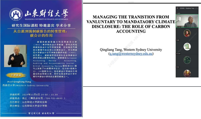 作为第一期讲座的特邀嘉宾,澳大利亚西悉尼大学商学院会计学教授、国际知名碳会计专家唐清亮教授为同学们带来了一场精彩的分享,聚焦碳会计领域的核心前沿观点。唐教授围绕国际会计准则委员会即将发布的“可持续与气候相关信息披露标准”,深入分析了碳会计在从自愿披露向强制披露转变过程中的关键作用。他通过案例剖析和数据支持,详细阐述了碳会计如何帮助企业识别碳排放相关风险、优化资源配置,并提升企业在全球市场中的竞争力。