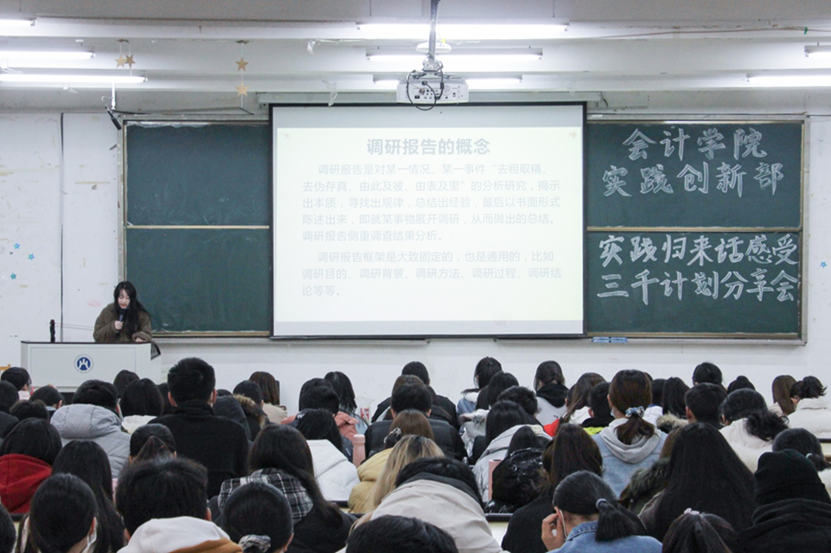 荀子曾曰:“见之不若知之,知之不若行之。”在青春岁月中,研读一本书籍,我们收获的是渊博知识,而将知识真正转化成力量的则是实践,脚踏实地的实践开启智慧的宝藏。11月28日晚18:40,由实践创新部主办的“三千计划”实践归来话感受分享会在圣井校区5-206教室举行,2020年“三千计划”优秀学生代表依次上台,为大一新生分享社会实践感受。活动由张浩然和孙晟焜主持。